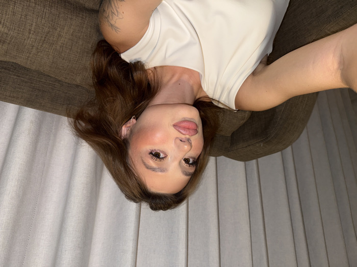 The image displays a head-and-torso selfie of a female individual, estimated to be between 20 and 30 years old, situated indoors in the city of Unknown, Unknown. She has medium brown hair and a fair complexion, wearing an off-white sleeveless top with a draped neckline. Visible features include significant facial makeup, a small hoop earring in her left ear, and a botanical tattoo on her left upper arm. The individual is positioned on a dark brown, textured upholstered sofa or armchair. In the background, light-colored, vertically pleated curtains are present. Her left arm is extended towards the camera, and she maintains direct eye contact with a neutral facial expression.