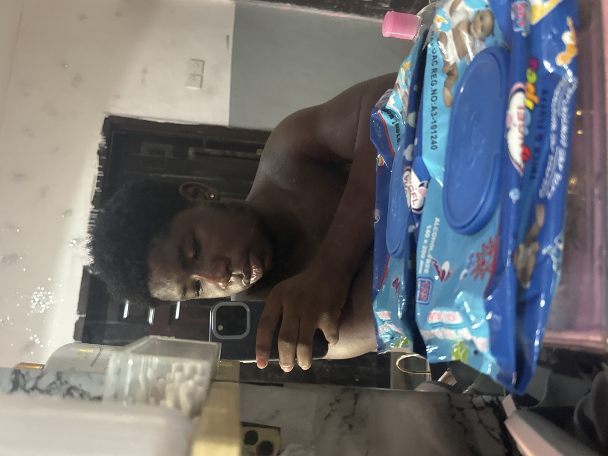 A selfie taken in a bathroom mirror. A dark-skinned person with short, curly hair is visible in the mirror, holding a smartphone to take the picture. The background shows a bathroom wall with a light switch, a dark-framed door, and what appears to be bathroom fixtures. In the foreground, a container of cotton swabs and blue baby wipes are present on the bathroom counter. The photo does not contain any information that can be used to determine a location in Ipetumodu, Nigeria.