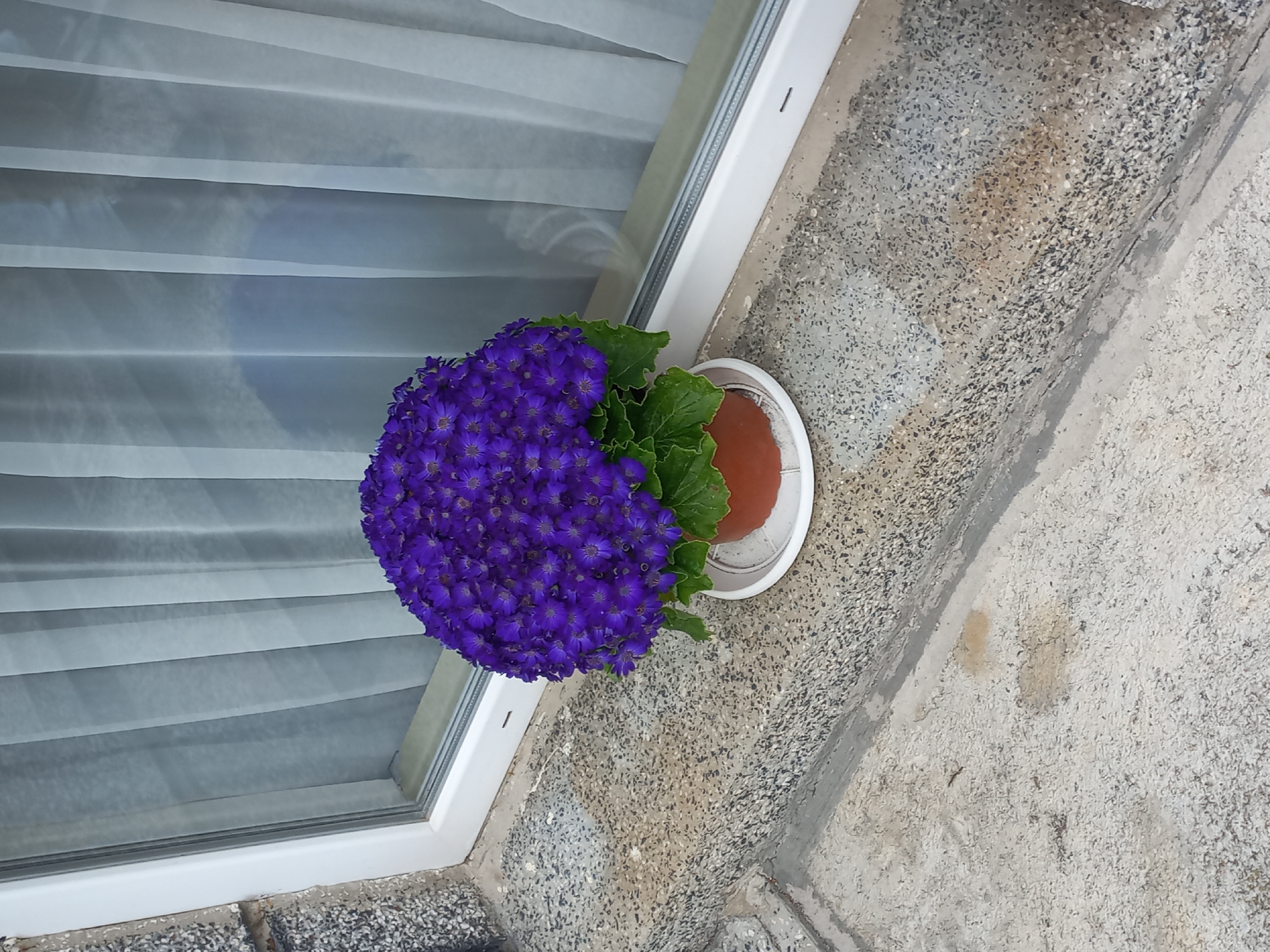 An outdoor scene depicts a potted plant with dense clusters of small, vibrant purple flowers and green foliage. The plant sits in a terra cotta-colored pot on a white saucer. This arrangement is positioned on a coarse, speckled grey stone windowsill. Behind the plant is a white-framed window with translucent white pleated curtains visible through the glass, along with reflections. To the left, a wall constructed of similar coarse, speckled grey stone is partially visible. The foreground consists of a textured, lighter grey concrete surface, possibly a sidewalk or ground, exhibiting minor discoloration and cracks. No people or active interactions are present. The location is an unspecified exterior building area in the city of Unknown, Unknown.
