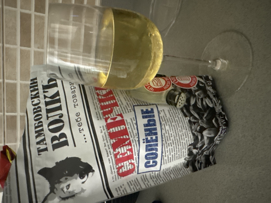 bag of sunflower seeds labeled “Tambovsky Volchik” in Cyrillic script, along with a glass of white wine