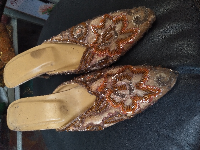 A pair of worn, embellished women's slip-on high-heeled shoes, commonly known as mules, rests on a dark, textured surface. The shoes feature a light tan or beige fabric base heavily adorned with intricate floral patterns composed of small, reddish-orange and bronze-toned beads and sequins. The pointed toes show signs of scuffing and discoloration. The interior soles are light tan, exhibiting visible dark smudges and dirt accumulation in the heel and arch areas, indicative of prior use. The heels, partially obscured, appear to be of moderate height. In the blurred background, hints of other decorative items, possibly a similar embellished object and a partially visible book or frame with a floral motif, suggest an indoor setting. There are no individuals present. No city or country information is discernible from the image content.