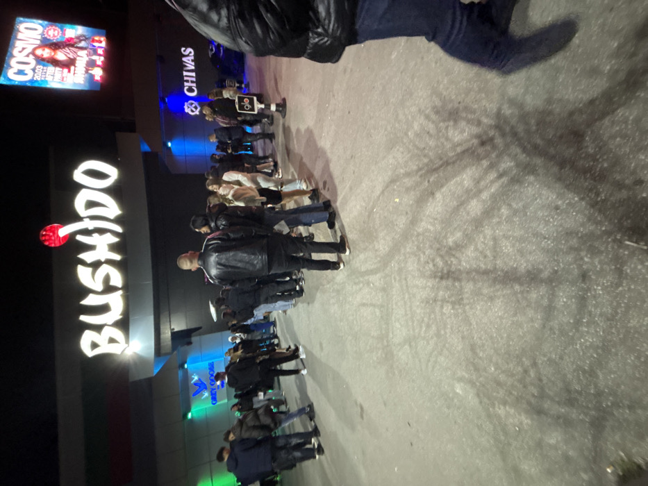 The image displays an outdoor nighttime scene at the BUSHIDO club/venue in Plovdiv, Bulgaria. Approximately 25-35 individuals are gathered on a paved surface, forming a queue extending from left-center towards the right. The building's dark facade is illuminated by various signs: "BUSHIDO" in large, white, cursive-style letters with a red circular fixture above the 'I'; a "Grey Goose" logo visible on the left; and a "CHIVAS" logo on the right. A digital billboard on the upper right prominently displays "COSMO" magazine branding and details for an "AFTER PARTY I NIKOLKA" event. A black standing advertisement or marker with a white "glo" logo is positioned near the CHIVAS sign. The individuals are dressed in casual evening attire, including jackets (leather and puffer), jeans, and dark clothing. In the central mid-ground, a male subject in a black leather jacket, facing away from the camera, appears to be conversing with a female subject beside him. The immediate foreground on the right shows the lower torso and legs of a person in a dark puffer jacket and blue jeans. The paved ground exhibits faint tire marks and numerous shadows cast by the subjects and unseen light sources, indicating a busy urban environment.