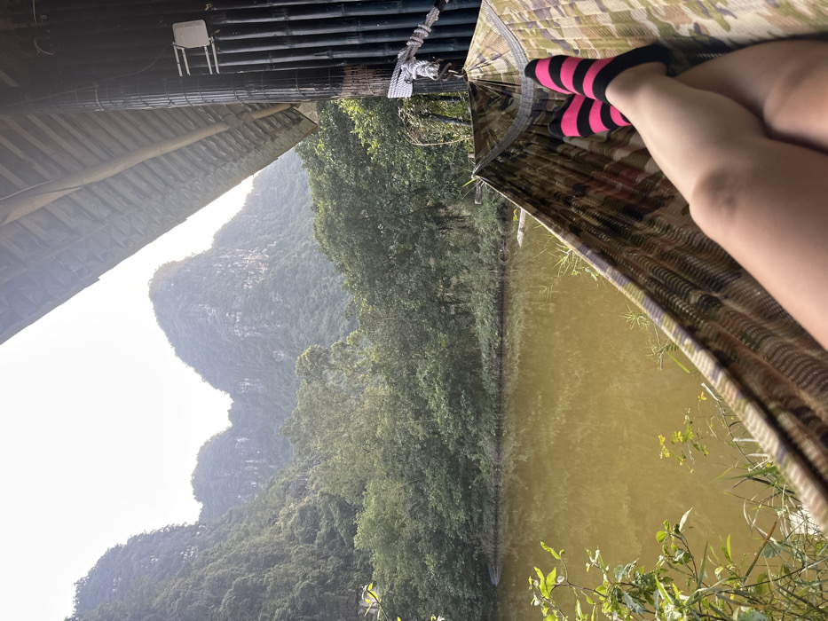 The scene depicts a natural landscape in Hoa Lư Ward, Vietnam, viewed from a first-person perspective while a person relaxes in a hammock. The foreground shows the lower legs and feet of an individual, wearing black socks with vibrant pink horizontal stripes, resting crossed at the ankles inside a camouflage-patterned woven fabric hammock. The hammock is suspended, with part of its attachment rope visible on the right. Beyond the hammock, a calm body of greenish-brown water, likely a lake or pond, occupies the midground, reflecting the surrounding foliage. The far bank of the water is lined with dense, lush green trees and vegetation. In the background, majestic limestone karsts, characteristic of the region, rise steeply, heavily covered in green trees and foliage, under a bright, somewhat hazy sky. To the upper right, structural elements of a building are visible, including a dark corrugated roof sloping downwards and a vertical support structure appearing to be made of dark, possibly bamboo-like, poles. A white rectangular electronic device, potentially a Wi-Fi antenna or router, is mounted on this vertical structure. The overall environment is one of tranquil natural beauty, integrating a recreational setup with the distinctive local geography.
