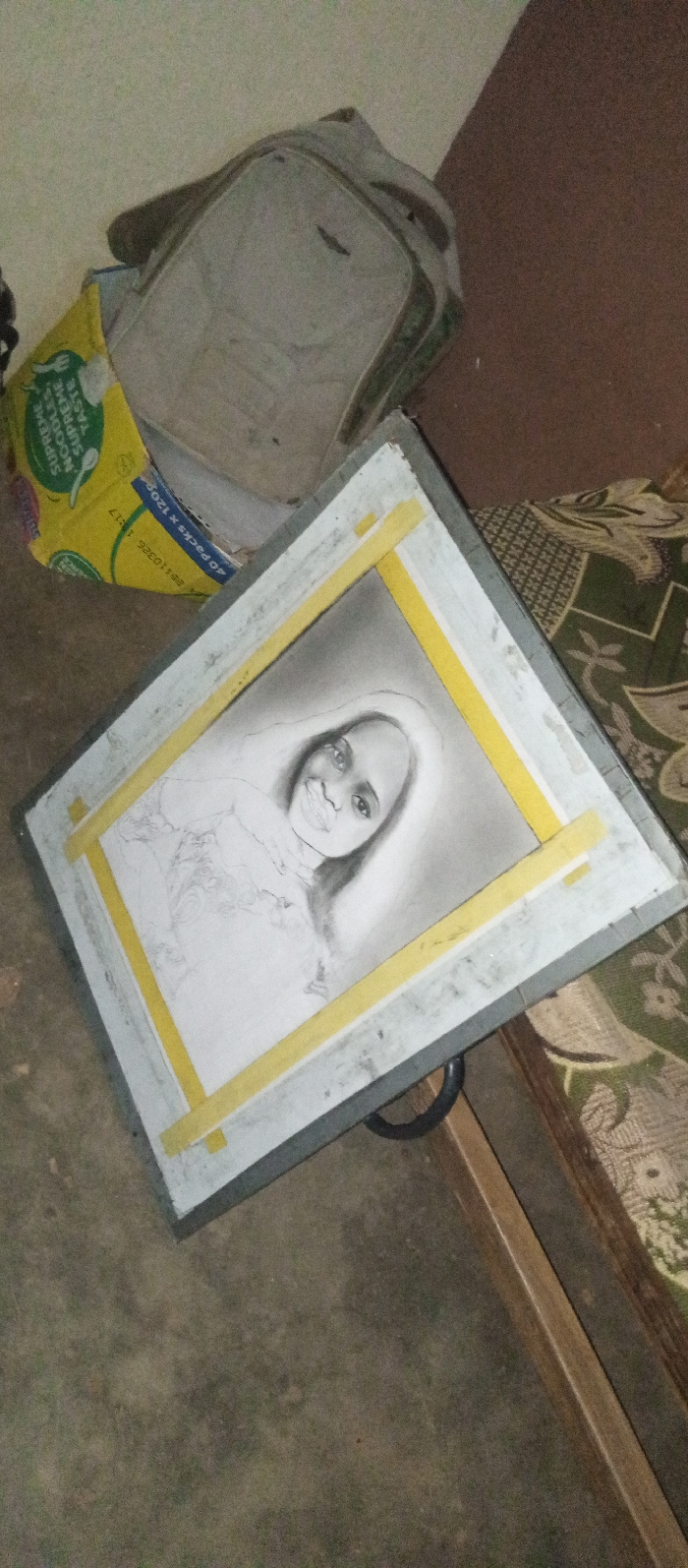 An unfinished charcoal portrait taped to a grey frame sits at an angle on a patterned surface. The portrait depicts a woman with a smile, flowing hair, and visible shoulders. Above the frame, there is a cream-colored backpack and a yellow box labeled "Supreme Noodles Supreme Taste." The surrounding area shows a dull floor and a dark brown wall.