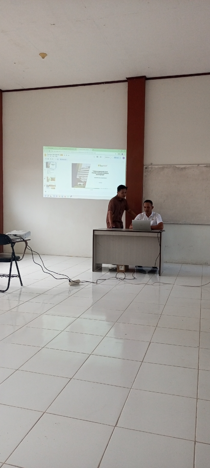 Two men stand in a tiled room. One, in a brown shirt, leans toward the other, who is seated at a desk with a laptop. A presentation is projected on the wall behind them. A projector sits on a chair to the left, connected to a power strip on the floor with visible wires. A brown pillar and a whiteboard are visible against the white walls.
