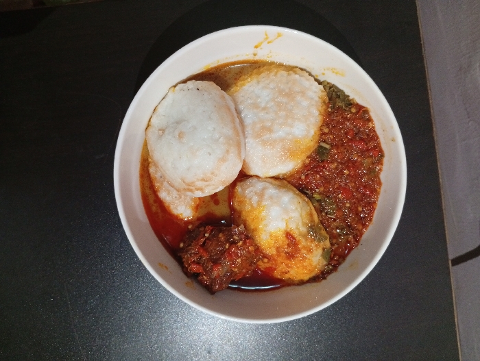 A white, round bowl containing a meal is positioned centrally on a dark, textured tabletop. The bowl holds three white, oval-shaped steamed dough items, partially immersed in a thick, reddish-orange pepper-based stew. The stew contains visible green elements and small red flecks. A piece of dark, stewed meat is visible at the lower left within the sauce. The tabletop surface is dark grey with a subtle granular texture. The immediate background is dark and out of focus. No individuals, specific actions, or interactions are depicted. The exact location within the city of Unknown, Unknown, is not discernible from this image.