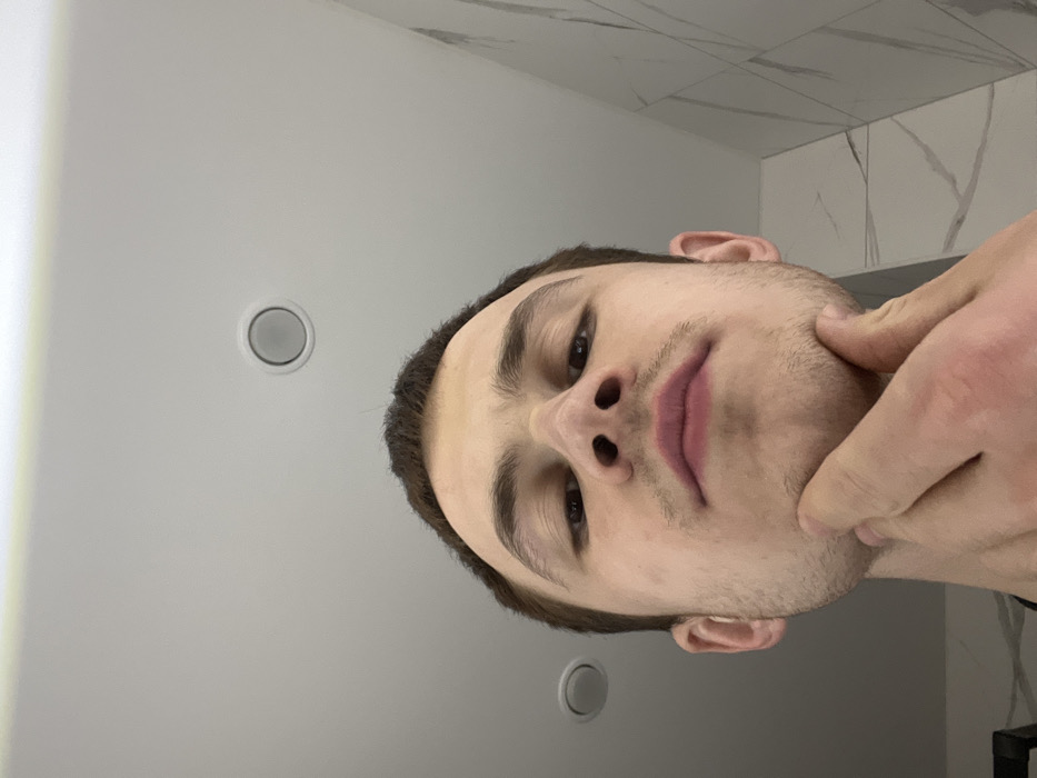 A close-up, tilted perspective shows a young man with light skin. He has dark brown hair, thick eyebrows, and brown eyes. His lips are slightly pink. He is clean-shaven except for some stubble on his chin and cheeks. His right hand is touching his face. The background consists of a white wall with recessed lighting and a tiled wall.