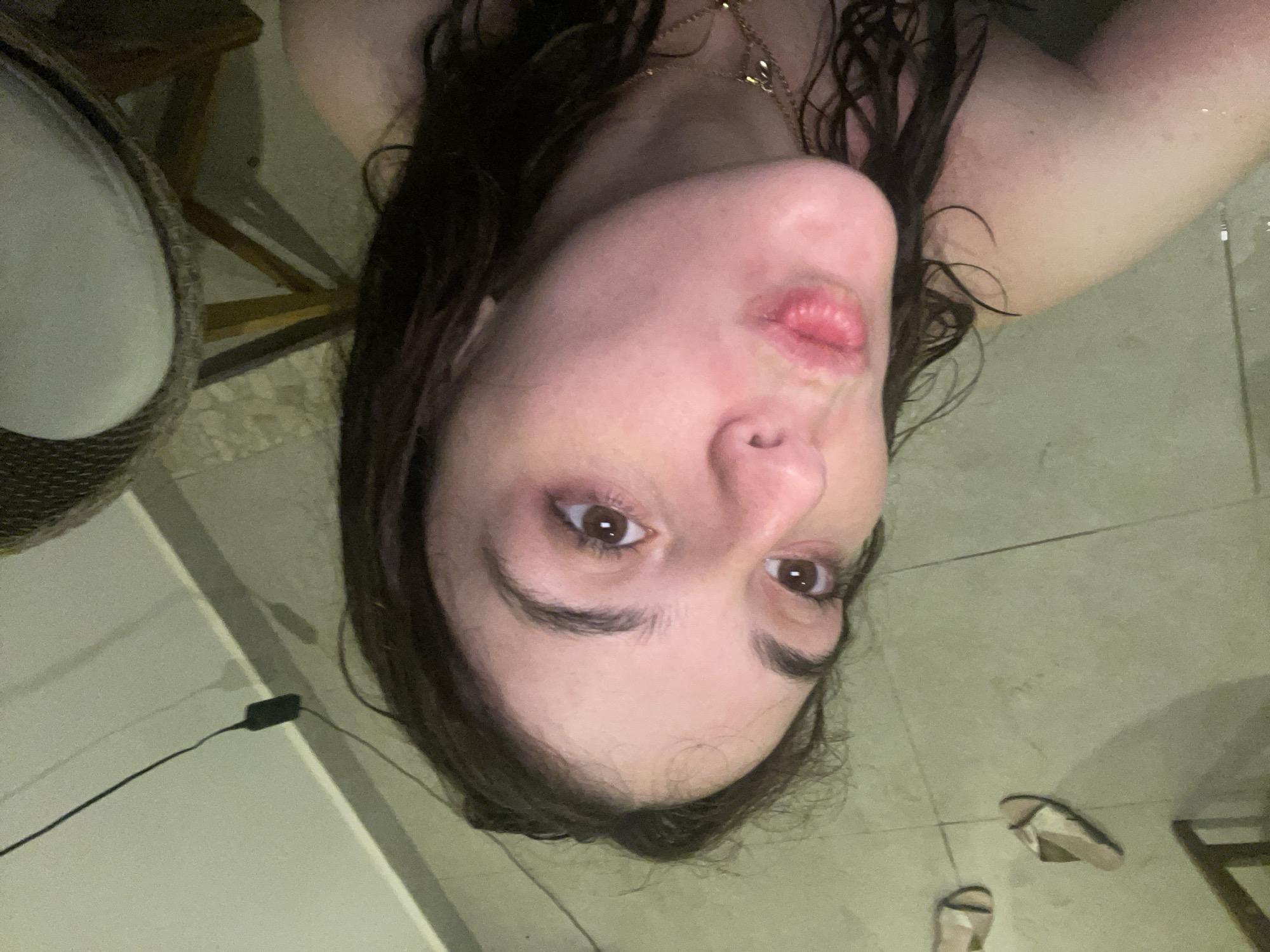 The image is a selfie taken from an upside-down perspective. The subject is a woman with dark, wet hair and brown eyes. She appears to be making a pursed-lip expression. A gold necklace is visible around her neck. In the background, tile flooring and a pair of sandals are visible. A portion of a wicker chair is visible as well. It is not possible to determine the location in the city of Brisas de Zicatela, Mexico, from this image.
