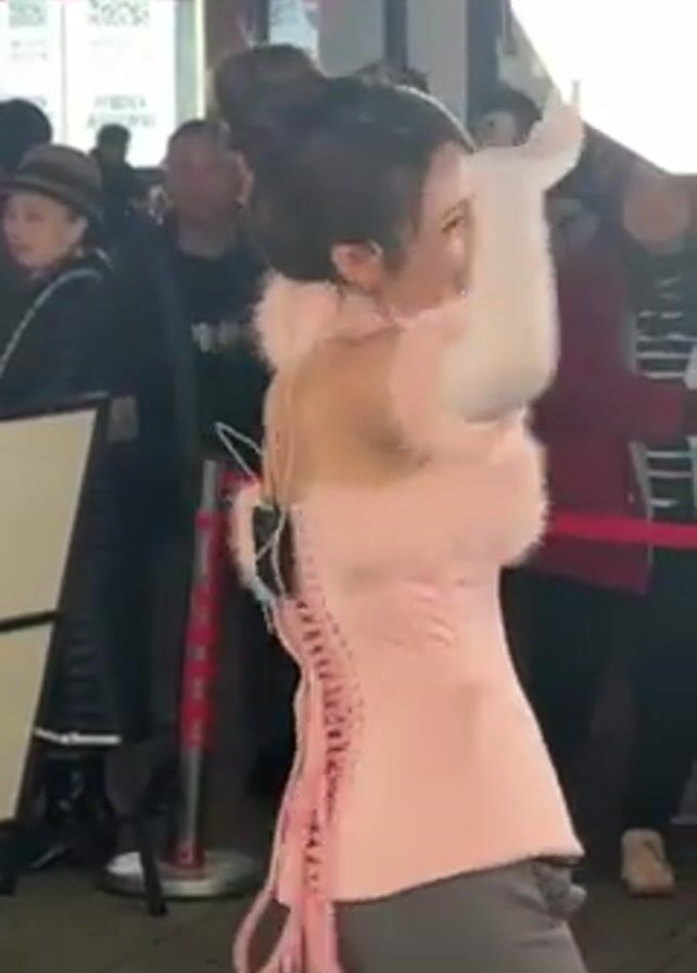 young Asian woman in a pink corset with fur trim, a grey skirt, and white gloves posing for photos in an outdoor public setting