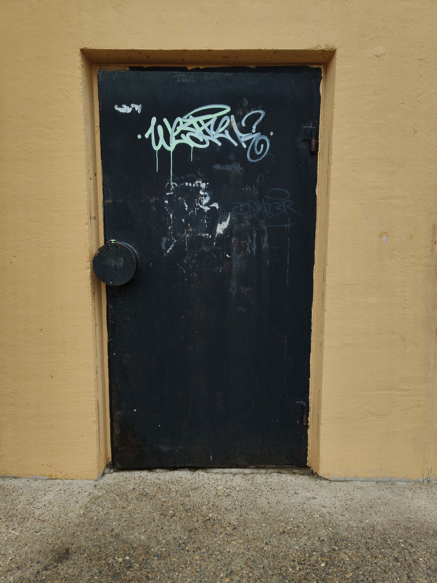 black door with graffiti, set in a yellow-painted wall. The door has a circular handle on the left and is stained with smudges and faded graffiti. There are two graffiti designs on the door. The first is in a light green color in the top left of the door. The second design is in the bottom right of the door. The wall surrounding the door is a light yellow or tan color, with slight variations in texture. The bottom of the door meets a concrete surface, which extends into the foreground.