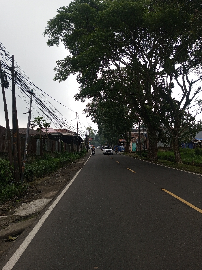 A long, straight asphalt road with yellow lane markings stretches into the distance, lined with lush green trees. A white car, a motorbike, and other vehicles are visible on the road. To the left, utility poles laden with wires stand beside a row of weathered buildings and overgrown vegetation. The sky is overcast, casting a soft light over the scene. A white line marks the edge of the road.
