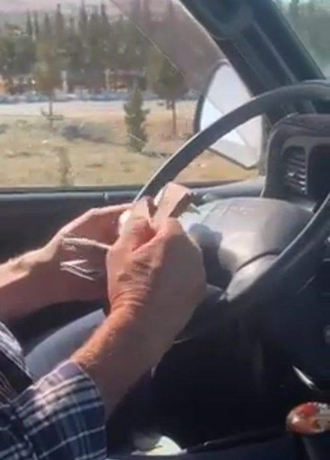 person in a driver's seat of a car, driving and counting money. The person is wearing a blue and white checkered shirt and blue pants. The car's interior is gray and black. Outside the car window, the landscape includes trees, a road, and distant mountains under a clear blue sky. Other cars pass by on the road. The driver's hands are clearly visible, shuffling and counting a stack of bills.