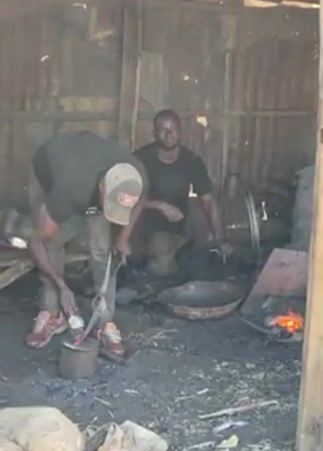 two men working in what appears to be a small outdoor blacksmith shop. The shop is crudely constructed of wood and corrugated metal. One man is standing and using a hammer to shape a piece of metal that is glowing orange-hot, having just been taken out of a small portable forge. The second man is sitting and operating a hand-cranked fan, likely to stoke the fire in the forge. There are various tools and materials scattered around the floor of the shop. The ground is covered in dark debris. The overall scene conveys a sense of manual labor and craftsmanship in a rustic environment.
