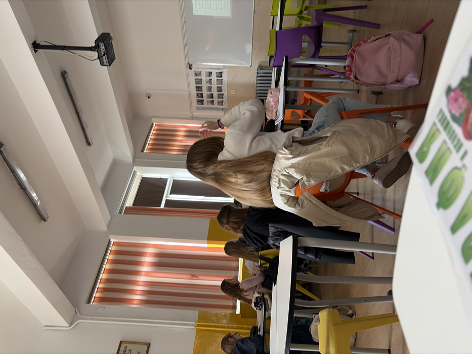 The image displays the interior of a classroom in Panagyurishte, Bulgaria