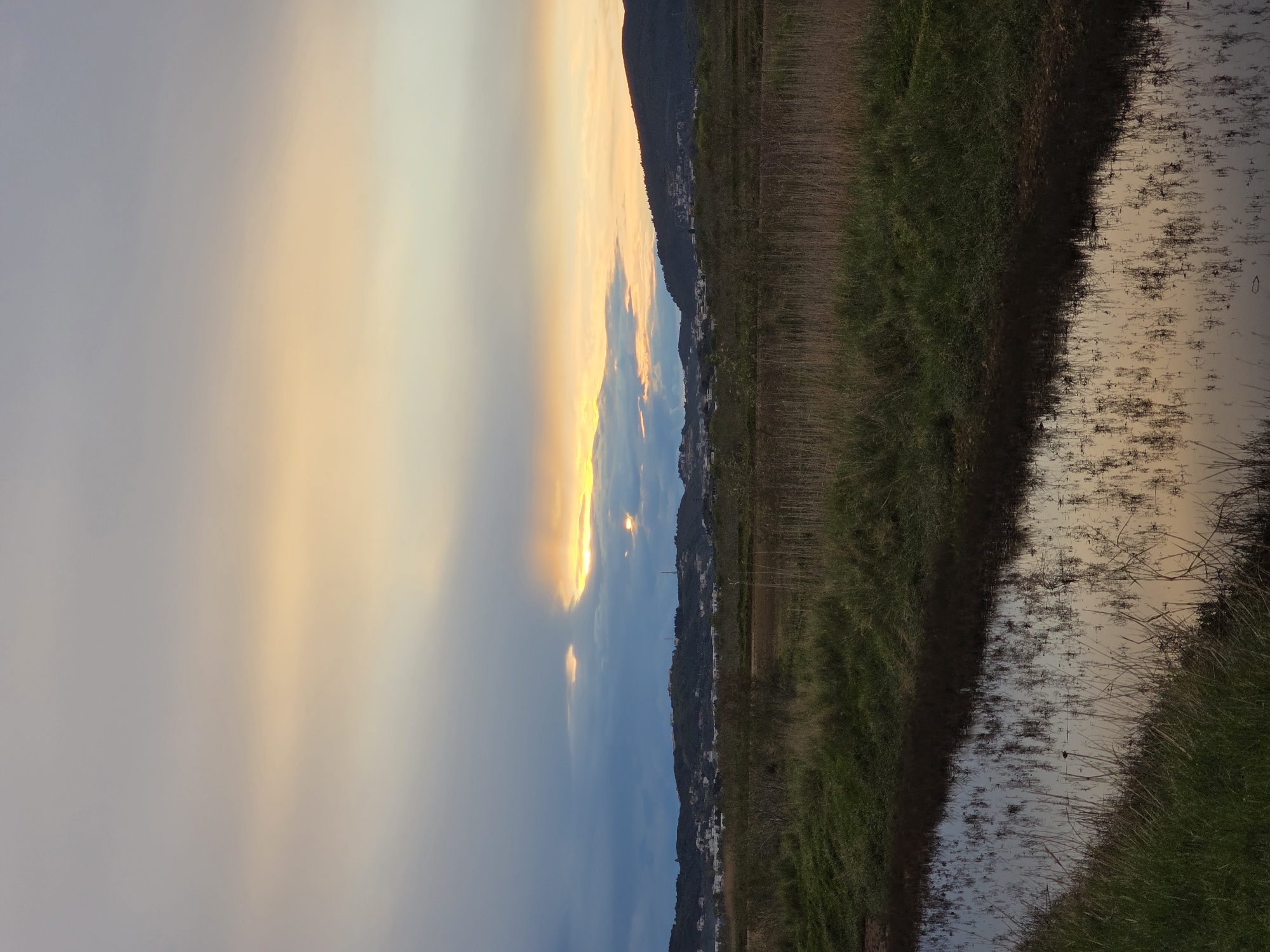 landscape scene at Donji Štoj, Montenegro. A body of water, possibly a canal or river, runs along the right side of the image, bordered by grass and vegetation. The water reflects the sky. On the left is a field with vegetation. A mountain range is visible in the distance. The sky is filled with clouds illuminated by the setting or rising sun, creating shades of yellow, orange, and blue. Buildings are sparsely scattered along the mountainside.