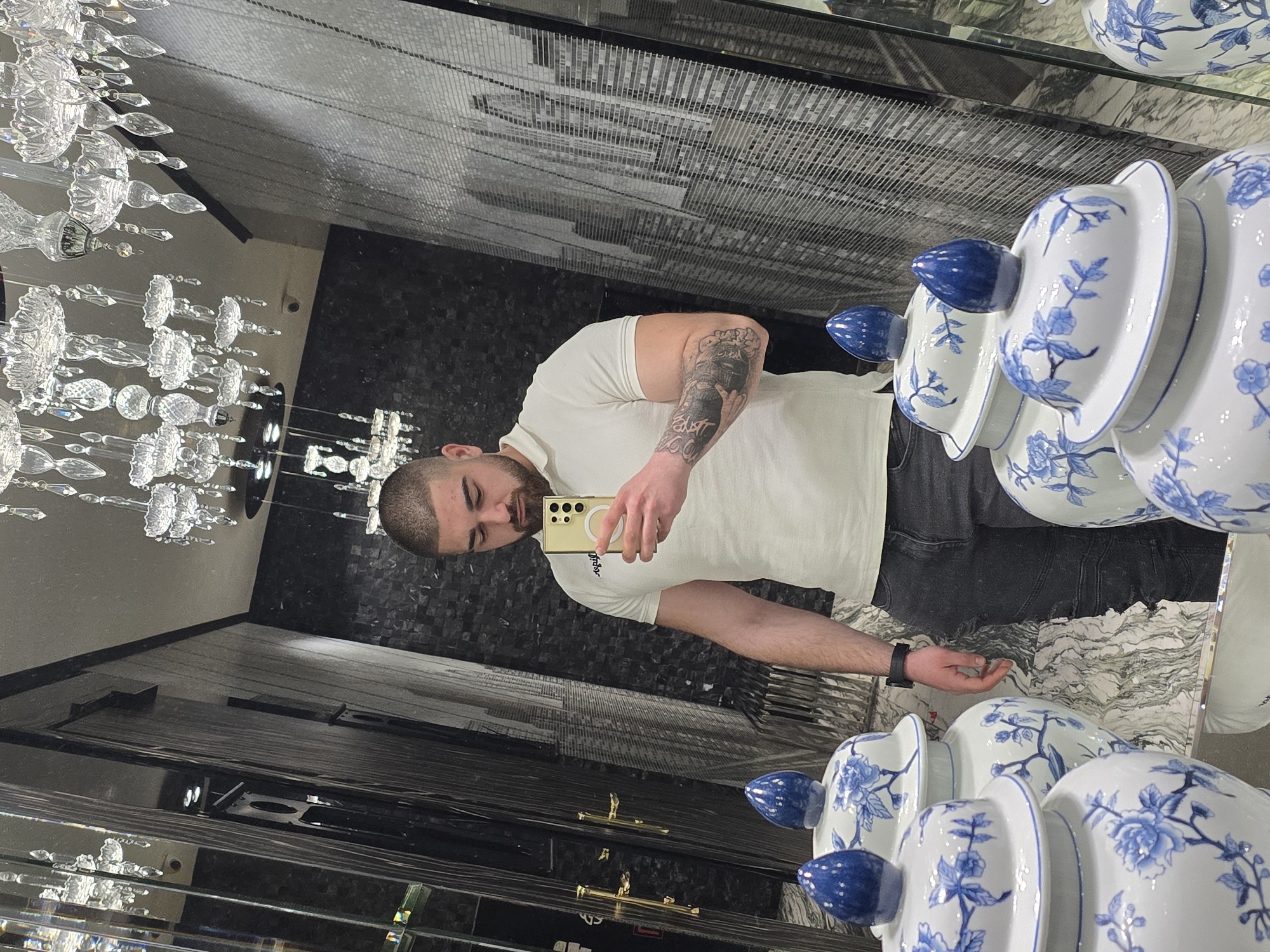 A man with a shaved head and a tattoo on his left arm is taking a mirror selfie in a bathroom with elaborate decorations. He is holding a gold-colored phone and wearing a white t-shirt and black jeans. The bathroom features a chandelier and blue and white ceramic vases. The location could be Sofia, Bulgaria.