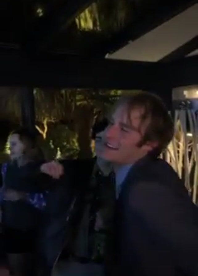 In an indoor, darkly lit venue, a man in a blue blazer and light blue shirt dances to music. He holds what appears to be a bottle or can in his hand. To his left, a person in a black jacket dances, but the rest of their body is out of view. Another individual, wearing a black coat, approaches the man in the blazer. The man in the blazer turns to face the individual in the black coat, and they touch heads as they embrace. The room has a partially open roof with visible foliage outside and string lights adorning a wall to the side. Other people can be seen in the background.
