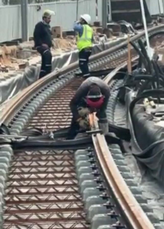 construction site with three workers present. One worker is in the foreground, bending over and using a cutting tool on a section of rail track. Sparks are visible as he cuts. The rail track is curved and appears to be under construction, with visible supporting structures beneath it. Two other workers are standing further back, one wearing a yellow hard hat and safety vest, and the other wearing a yellow hard hat and dark clothing. They appear to be observing or discussing the ongoing work. The background includes a white fence, some construction materials, and building structures.