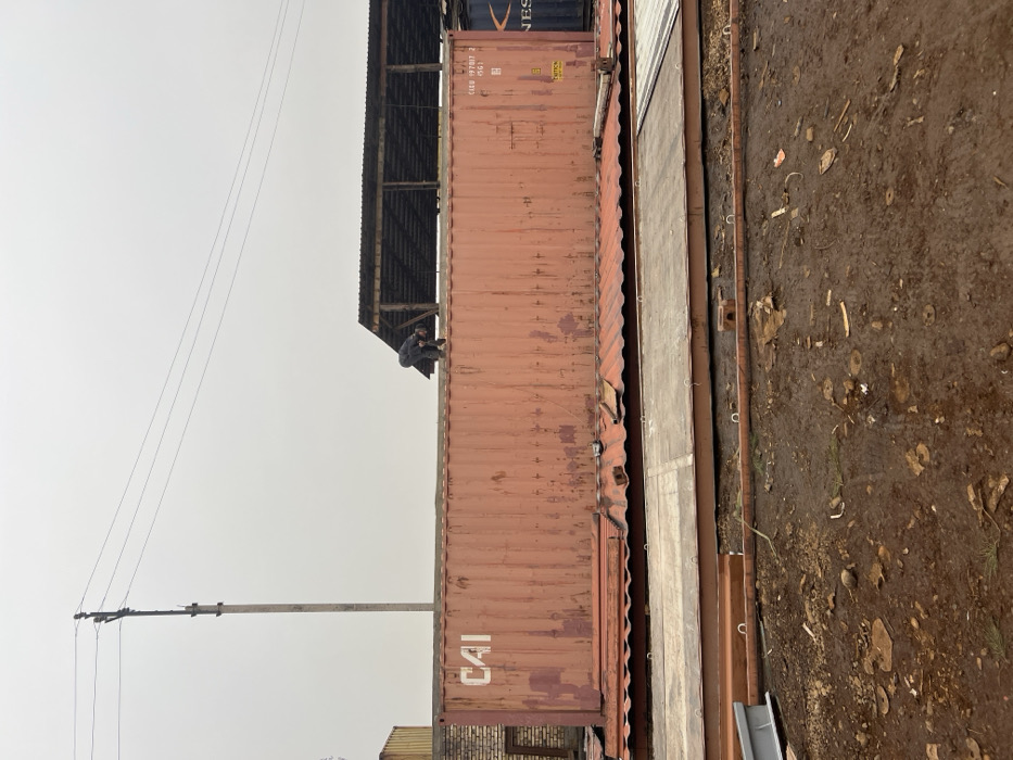 The image depicts an outdoor industrial or storage yard in Andijan City, Uzbekistan, under an overcast sky. A single individual, dressed in dark clothing, is positioned on top of a weathered, rusty red shipping container marked "CAI" and "CLEU 797017 2 45G1". The person is bent forward at the waist, engaged in an unspecified action on the container's surface. Below the red container, several rusty corrugated metal sheets are laid flat, partially covered by large, rectangular, flat metal plates. The foreground consists of muddy, uneven ground littered with various debris, including small pieces of wood and refuse. In the background, to the left, a tall utility pole with multiple overhead power lines stands vertically. To the right, a dark, open-sided structure with a corrugated roof is visible, along with a portion of a blue shipping container. A brick wall and a yellowish container are partially visible on the far left.