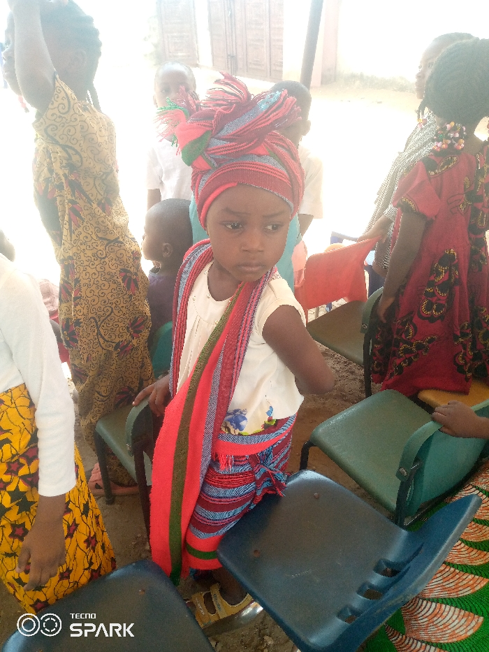 In Ajaokuta, Nigeria, a young girl wearing a red, green, and blue striped headwrap and a matching sash stands among a group of children in an outdoor setting. She wears a white top with a blue floral design on the bottom. The children are sitting on or standing near rows of blue and green plastic chairs. Other children are wearing traditional African dresses. There is a "TECNO SPARK" logo in the lower-left corner of the frame, indicating a smartphone camera was used to capture the image.
