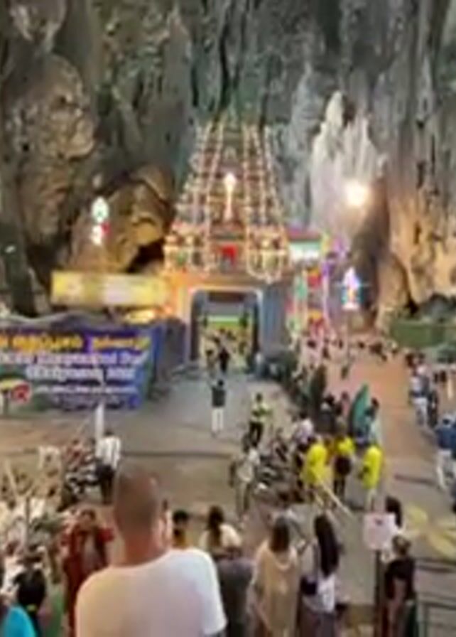 The camera is positioned at an elevated vantage point, possibly a set of stairs, looking out into a large, open cavern, crowded with people, and featuring a Hindu temple. The temple is centrally located and vibrantly decorated with multiple tiers. A banner is present, inscribed with text in a language other than English, possibly Tamil. The cavern's walls are natural rock formations with light gray and brown tones. Artificial lighting illuminates the scene, enhancing the color of the temple and the activity of the people. The people are diverse in appearance, some wearing face masks. They are walking and standing around the paved area within the cave. The camera pans upward to show the height of the cave's ceiling.