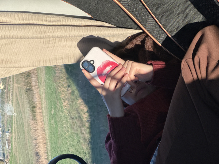 The scene depicts an individual inside a vehicle, with a rural landscape visible through a window, placing the location within the vicinity of Cerveteri, Italy. A person, gender indeterminate, occupies the lower central portion of the frame. They are reclined, wearing a maroon long-sleeved top and dark brown trousers. Their lower face is partially obscured by a white smartphone held in both hands, angled upwards. The phone's rear case features a prominent red, parted lip graphic, and a dual-camera system is visible near the top edge. Strong natural sunlight enters from the left, casting distinct shadows across the phone, hands, and the individual's attire. To the right of the person, a light beige, patterned curtain is drawn back against a dark grey, textured vehicle seat with a brown accent stripe. Through the vehicle's window, a daylight view reveals expansive green fields and drier vegetation. Faint structures are discernible in the distant background under a bright sky. The window glass exhibits multiple smudges and a distinct white splash mark, likely from a bird, in the upper left quadrant. A partial black circular object, consistent with a vehicle's steering wheel or interior control, is visible on the far left edge of the frame.