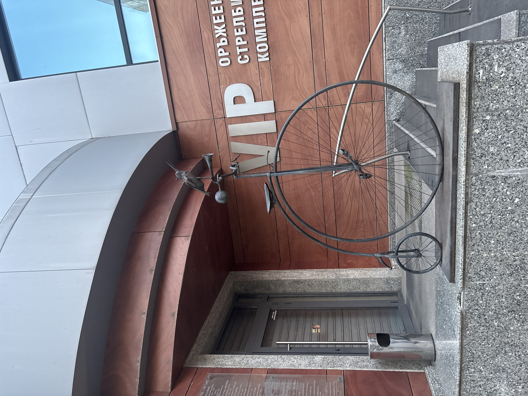 bicycle sculpture in front of a building in Sofia, Bulgaria. The building has a sign in Cyrillic that reads "ОРЪЖЕЕН СТРЕЛБИЩЕН КОМПЛЕКС" and "VIP". The bicycle is a high-wheeler type with a large front wheel and a small rear wheel. There's a bird sculpture attached to the bicycle. The building has a gray marble facade and a brown wooden exterior. There are stairs leading to a door, next to which is an ashtray. A plaque is present near the door.