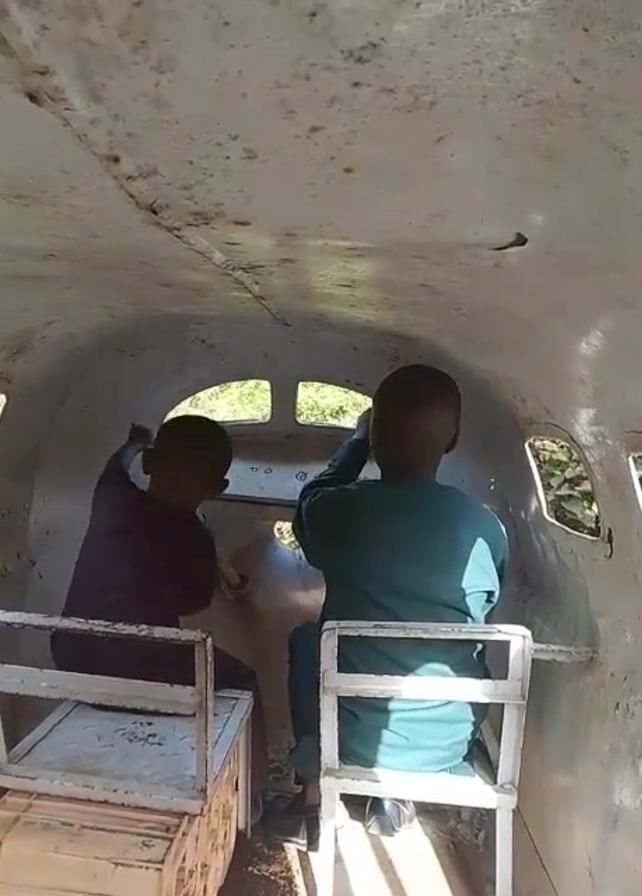 Two children are sitting in the cockpit of what appears to be a mock-up airplane. Both have their backs to the camera, and the boy on the left is manipulating a steering wheel. The boy on the right appears to be pushing on objects in the window area. There are chairs built into the cockpit. The inside of the structure appears worn. Sound includes the noise of a car horn.