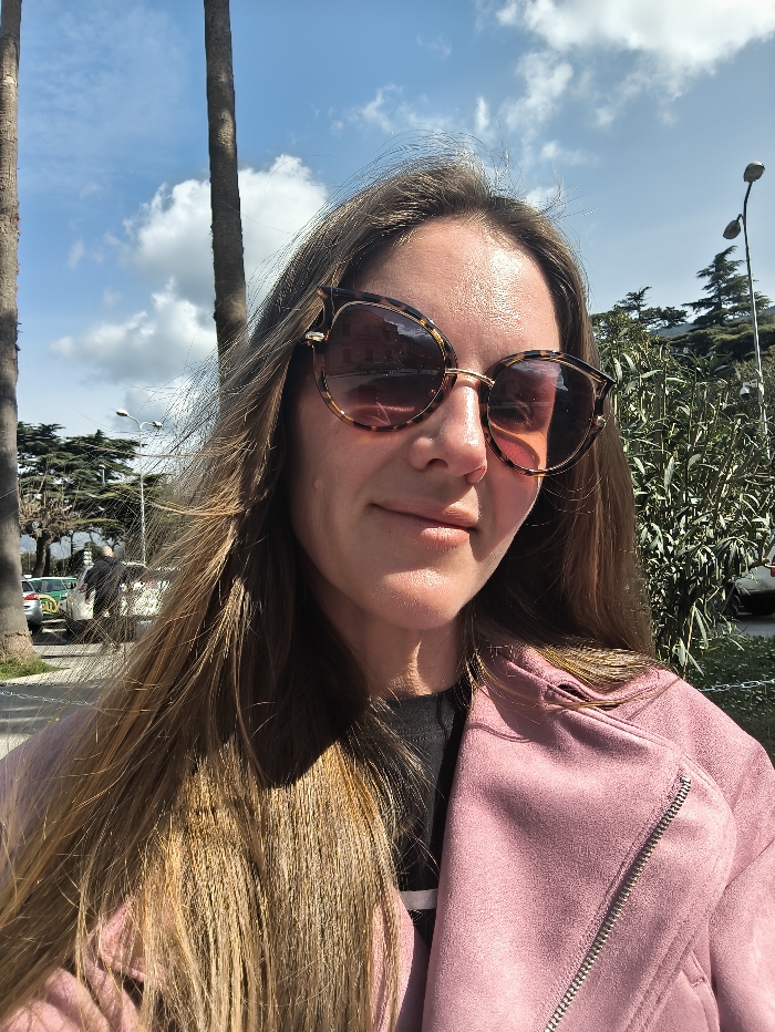 A female individual is depicted in a close-up, outdoor portrait against a backdrop identified as Dobrota, Montenegro. The subject occupies the majority of the frame, positioned centrally with her head slightly angled. She has long, light brown hair, parted on the left, and wears large, tortoiseshell-patterned sunglasses with reddish-brown tinted lenses. A faint, closed-mouth smile is visible. She is dressed in a pink, suede-textured moto-style jacket, partially open to reveal a dark-colored garment underneath; a silver zipper is visible on the jacket's right side. The background shows a sunlit outdoor environment. To the left of the subject, two tall, slender tree trunks are visible, extending upwards into a blue sky with scattered white, cumulus clouds. Beyond these trees, a street or promenade is discernable, featuring several parked vehicles, including a light-colored taxi with partial livery details, and a distant, out-of-focus male figure walking. Multiple streetlights and green foliage, comprising various bushes and trees, line the street and extend across the mid-ground. The scene is illuminated by strong natural sunlight.