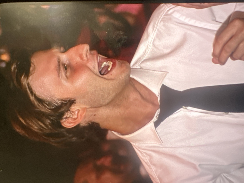 An indoor scene depicts a light-skinned male with brown hair, appearing to be in his 20s or 30s, captured in a profile view turned slightly to the right. He wears a white collared shirt and a dark necktie. His mouth is wide open, revealing upper and lower teeth, with a light-colored, amorphous substance present on the lower teeth and tongue, and a reddish stain visible beneath his lower lip. His right hand is partially visible in the lower right foreground with fingers slightly curled. The background is dark, blurred, and out of focus, containing indistinct shapes and muted light sources, consistent with a low-light social gathering. No specific location within Colombes, France, can be identified from the visual data.