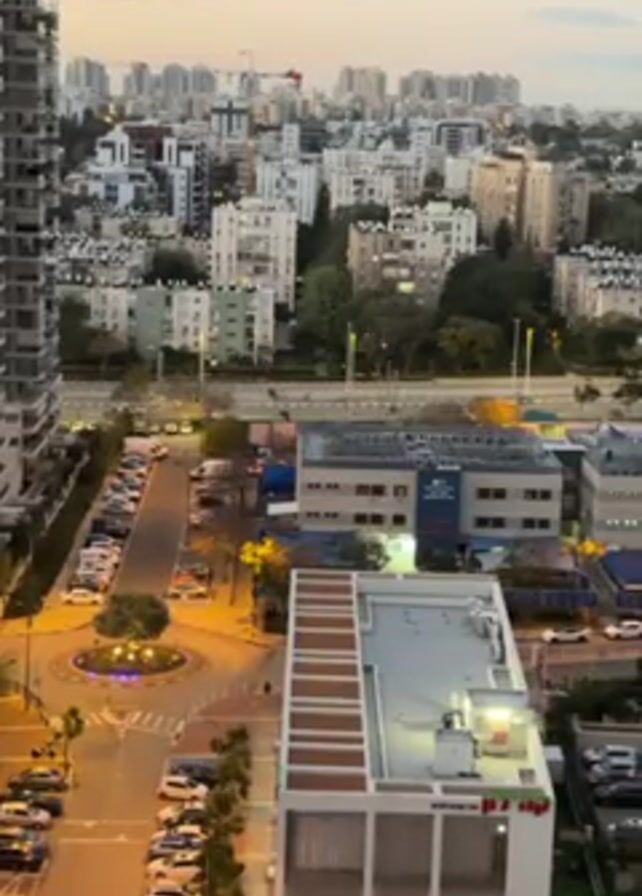 The video showcases a city view at twilight, featuring buildings of various heights and colors