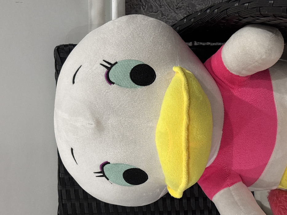 - "A large plush toy, depicting a white duck-like character, is seated in a dark, possibly woven or rattan, armchair" by FM-UCF3H3, licensed under CC BY 4.0