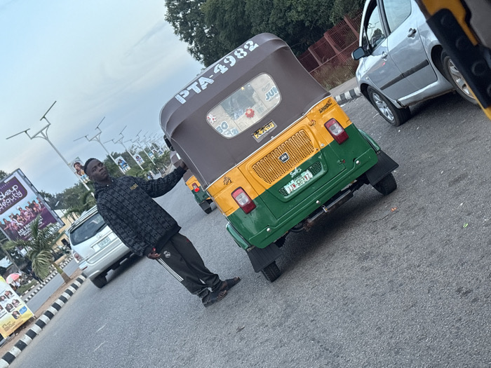 This image depicts a daytime urban street scene in Barakin Lerawi, Nigeria, under a diffuse, light blue sky. A male individual, appearing young to middle-aged with dark complexion and short, dark hair, stands on the asphalt roadway in the left-center of the frame. He wears a dark, possibly patterned, long-sleeved hooded top with a light-colored emblem on the chest, dark athletic pants with three white stripes on the left leg, and dark athletic shoes. His right hand rests on the rear-left portion of a three-wheeled passenger vehicle (tricycle/Keke NAPEP). He is looking directly towards the camera. The three-wheeled vehicle, centrally positioned, features a yellow and green body with a dark brown canvas canopy. "PTA-4982" is stenciled in white on its rear canopy. The rear of the vehicle displays a Nigerian license plate, "LAGOS JIN-5B8VZ." Another similar tricycle is partially visible further down the road. Behind the prominent tricycle, a silver or light grey four-door hatchback car (possibly a Peugeot) is visible on the right side of the road. Further down the road on the left, a silver SUV or minivan is parked. The asphalt roadway exhibits minor cracks and wear. Along the left side of the road, a black and white striped curb or median separates the roadway from a sidewalk or undeveloped area. This area features multiple modern streetlights with multi-arm designs and several large commercial billboards. One billboard prominently displays "dayup beauty" with images of people. Green trees, shrubs, and a palm tree are visible in the background and along the roadside.