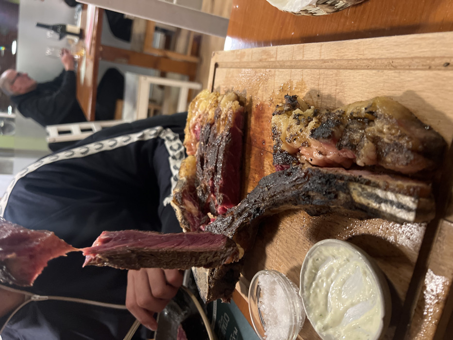 A close-up shot reveals a large, grilled steak on a wooden cutting board. The steak, cut into sections, displays a variety of textures, including crispy charred areas, succulent medium-rare portions, and visible fat. Accompaniments include small containers of salt and a creamy white sauce. A person holding a slice of steak is visible in the foreground, while in the blurred background, another person is seen at a table with wine glasses.
