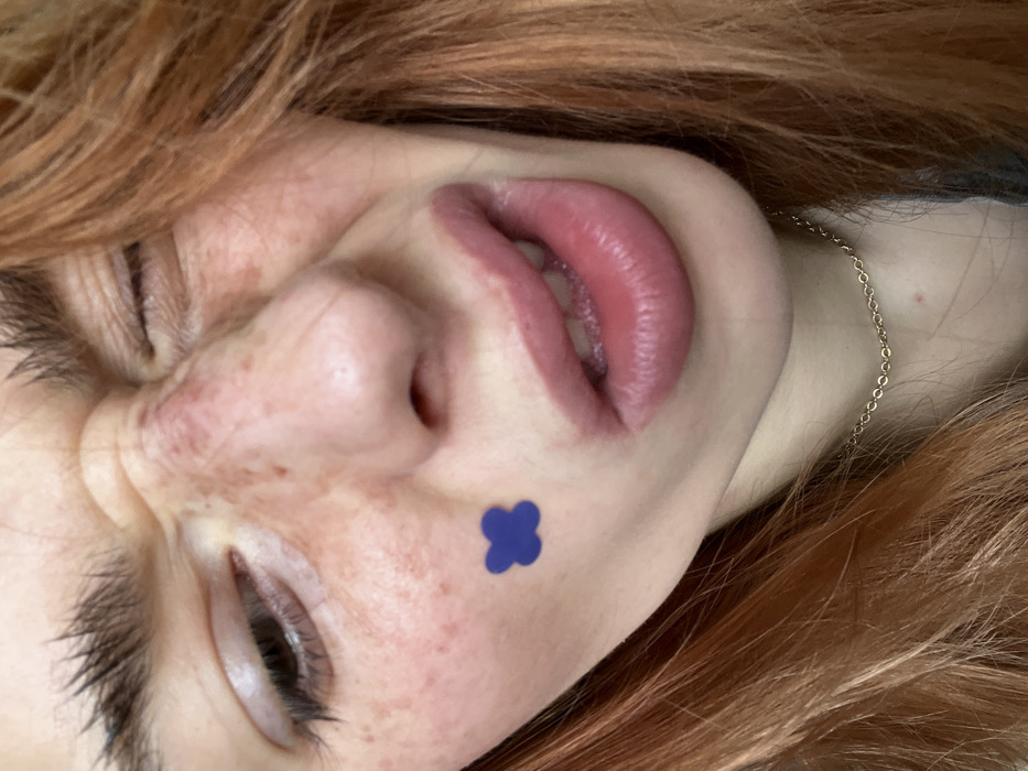 A close-up portrait features the head and upper chest of a person with long, reddish-orange hair and fair skin, notable for numerous freckles on the cheeks and nose. The individual's face is contorted into a grimace: the left eye (viewer's right) is partially open and directed downwards, while the right eye (viewer's left) is tightly squinted, forming wrinkles around it. The nasal bridge is visibly scrunched and exhibits localized redness. The mouth is slightly agape, revealing full lips and visible teeth. A small, dark blue, four-lobed sticker is adhered to the left cheek (viewer's right) below the eye. A thin, gold-colored chain is worn around the neck. The background is out of focus and indistinct. No visual elements within this image provide information regarding a specific geographic location, including the city of Ivry-sur-Seine, France.