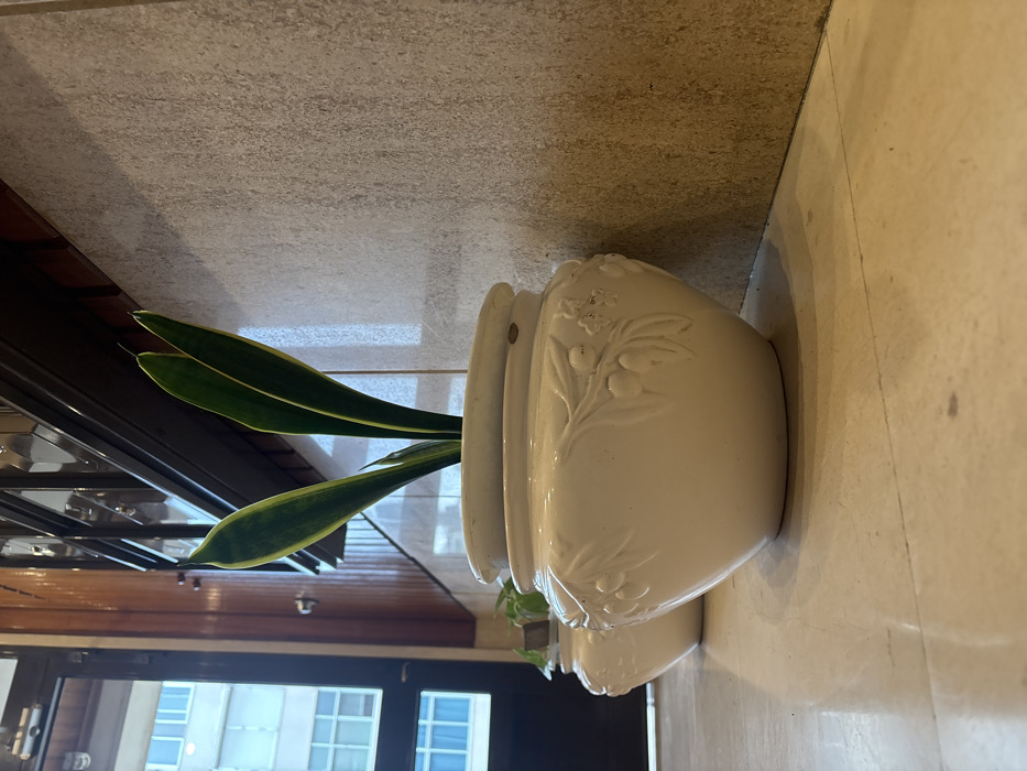 The image displays an interior ground-level perspective, likely a building entrance or hallway, with a view towards the exterior. In the foreground, a light-colored, reflective tiled floor is visible, exhibiting minor surface variations. Two white ceramic planters are positioned on this floor. The foremost planter, centered, is a rounded, glossy white vessel adorned with embossed olive branch motifs. It contains a snake plant (Sansevieria trifasciata) with several upright, variegated green and yellow sword-shaped leaves. Behind it and to the left, a second, smaller white planter holds a different green leafy plant. To the right, a light beige or grey textured tiled wall rises vertically from the floor. In the background, a dark-framed glass door is open to the left, revealing the facade of a multi-story urban building with multiple rectangular windows. Above the door and extending across the upper background, dark wooden paneling incorporates several reflective square or rectangular elements. Natural light appears to originate from the left. The specific location within the city of Lisbon, Portugal, cannot be determined from the visual information provided.