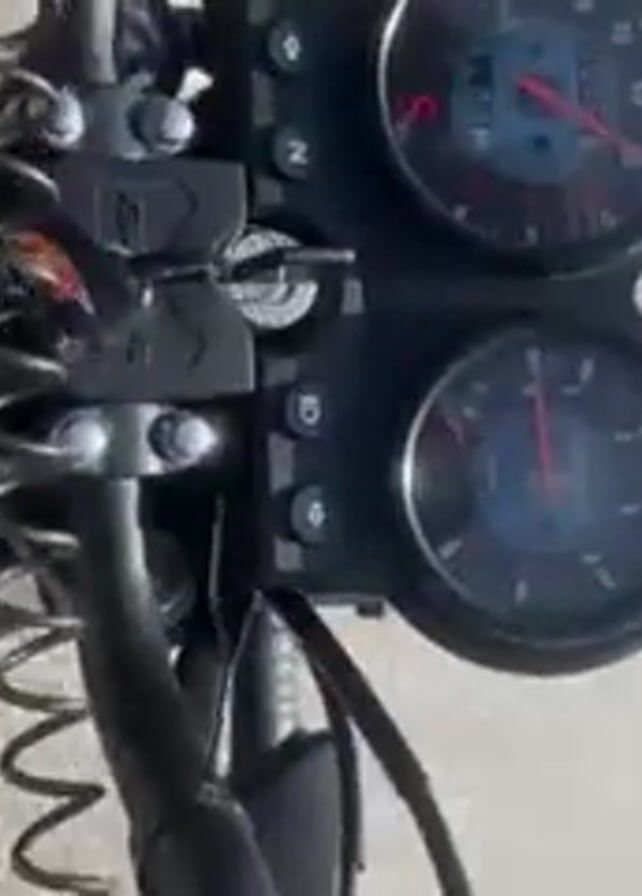first-person perspective of someone riding a BRF motorcycle on a road. The camera is mounted on the handlebars, providing a view of the instrument panel and the road ahead. The motorcycle is moving, and other vehicles can be seen in the background. The environment includes buildings and a mountain in the distance. The video captures the rider's view as they navigate the road, showing the speedometer, the road, and the surrounding scenery. The motorcycle is primarily blue and gray.