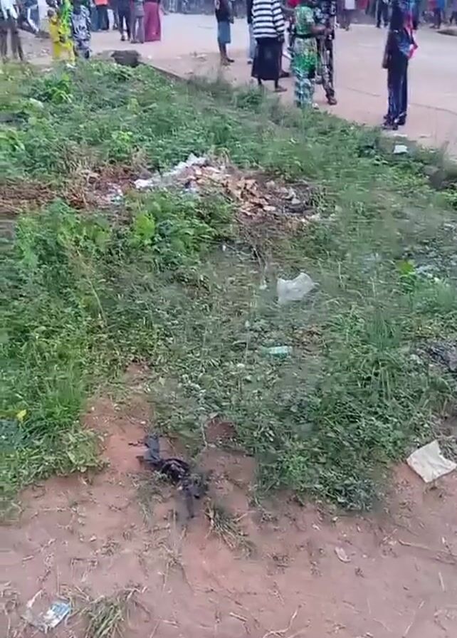 gathering of people on a street or road. A group of individuals stands in the background, some wearing colorful clothing. There is a grassy area in the foreground, possibly a ditch or roadside. It contains trash and litter. A car passes by in the background. The overall environment suggests a rural or suburban area.