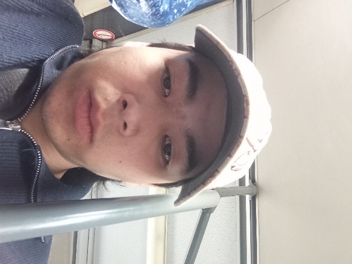 A close-up, low-angle self-portrait depicts an individual, an adult male, likely of East Asian or Central Asian ethnicity, in an indoor environment resembling public transport