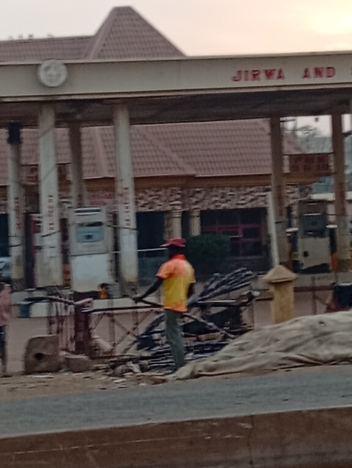 A man wearing a red hat and yellow shirt stands in front of construction debris, with a building in the background. The building has a tile roof, columns, and a sign that reads "JIRWA AND". Gas pumps are visible behind the debris. The scene appears to be outdoors, possibly at a construction site near a gas station.