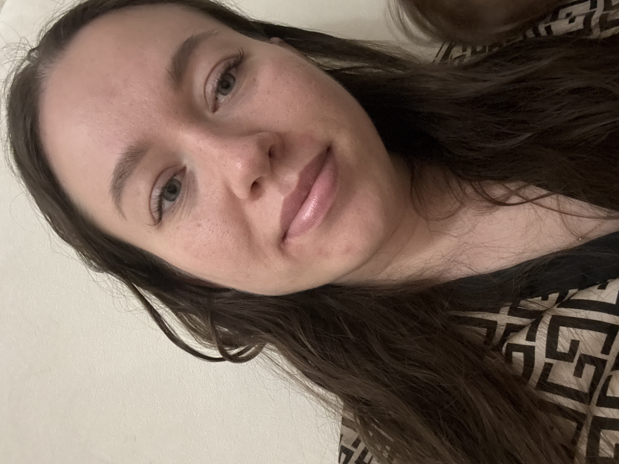 A close-up, angled, selfie-style image features a fair-skinned woman with long, dark brown hair. She has light greyish-green eyes, well-defined eyebrows, and appears to be wearing lip gloss. Her skin shows some pores and slight freckling. She is wearing a patterned black and beige top. The background is a plain white wall. There is no indication of the location being Ферма, Russia in the image.