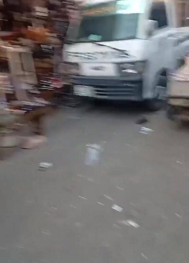 street scene in what appears to be a market. A small white truck is parked on the left. The ground is littered with debris. Several people are walking around. Mannequins dressed in clothing are visible on the right. Stalls with various items for sale line the street. The video is shaky, giving the impression it was taken while the camera operator was walking.