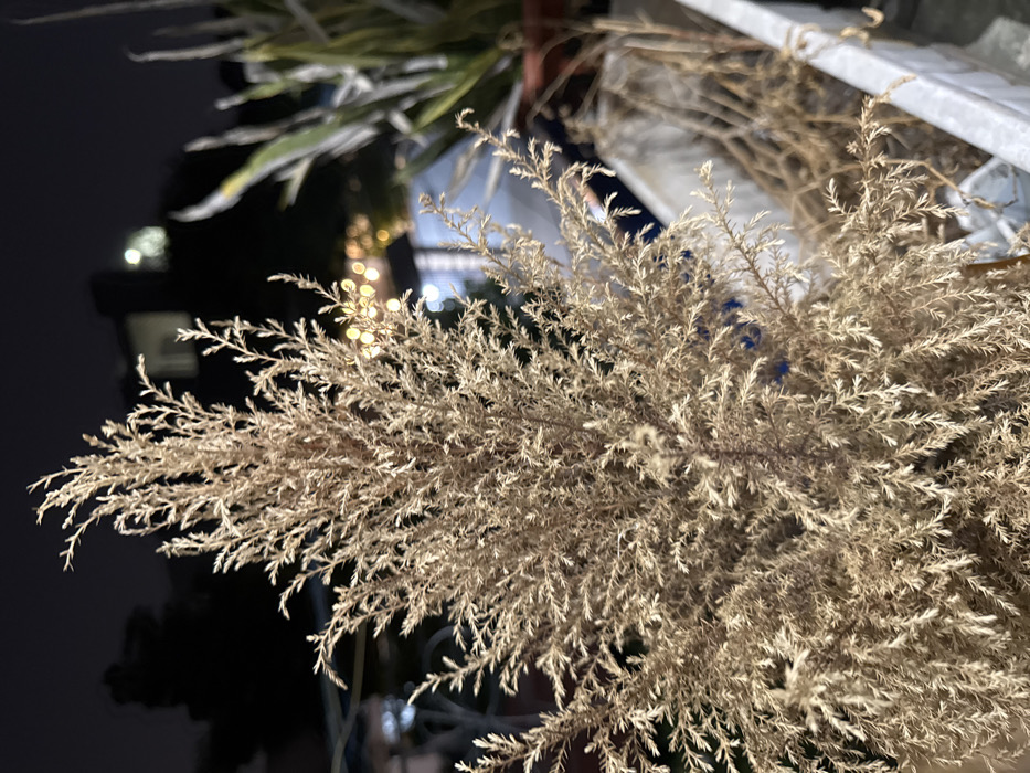 The scene depicts an outdoor setting at night in Dĩ An, Vietnam. A prominently featured, dried conifer-like plant with light tan, finely textured foliage occupies the majority of the foreground. In the blurred mid-ground, a string of warm-toned, spherical lights is visible, suggesting an illuminated establishment. To the right, an out-of-focus plant with broader, green-tinged leaves stands next to a white rectangular planter containing additional dried organic material. The dark background reveals a dimly lit building with a discernable window on the left, and another indistinctly lit structure or object further right. No individuals or active subjects are present.