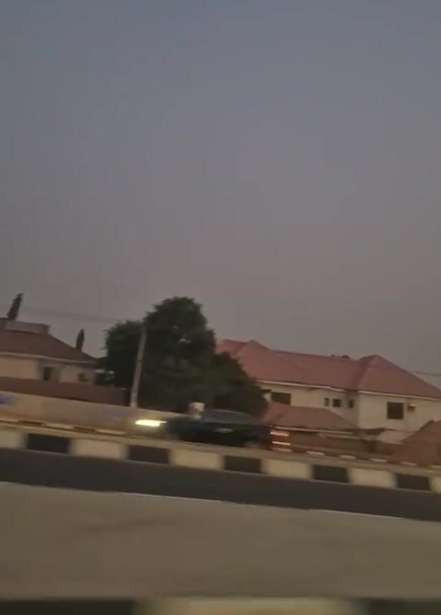 The video is shot from a moving vehicle driving along a road in what appears to be a residential area at dusk or dawn