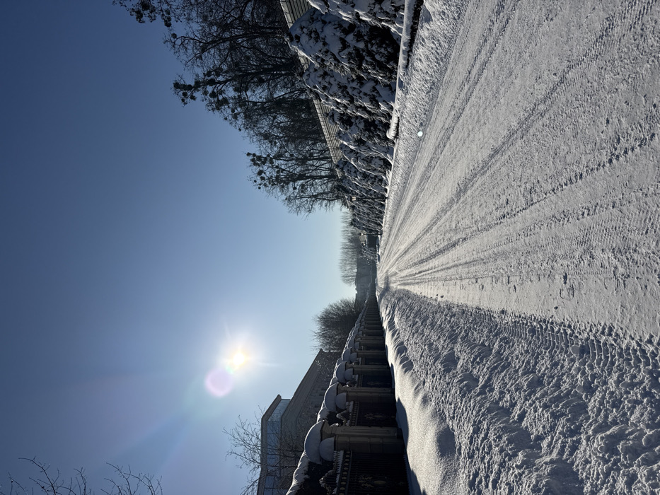 A winter road leads into the distance under a clear blue sky. The sun shines brightly, creating a lens flare. Snow covers the road, marked with tire tracks. Snow-covered bushes and trees line one side of the road. Buildings peek out from behind a snow-laden ledge on the opposite side. The image is oriented sideways, with the sky to the left and the road angling upwards.