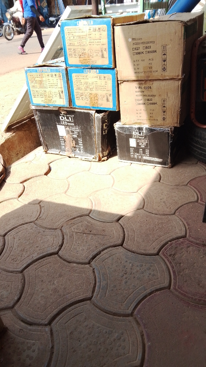 The scene is an outdoor commercial area in Shaba, Nigeria. The ground is paved with light brown interlocking concrete pavers, partially illuminated by direct sunlight which casts sharp shadows. A display of packaged goods occupies the left and center of the frame. Four blue and white cardboard boxes, labeled "LED BULB" with specifications including 13W, AC220-240V, 3000K-6500K, E27/B22 bases, and a quantity of 100 PCS, are stacked above larger black boxes. Adjacent to these are two light brown cardboard boxes with similar LED bulb details, identifying models 'WAI 13W' and 'V-BL-4405.' Below these, several black boxes branded "DLT LED BULB 30W" are visible. A white-framed solar panel leans vertically behind the stacked blue boxes on the left. In the background, a person wearing a blue shirt, dark trousers, and pink flip-flops walks from left to right. A motorcycle is partially visible behind the person. A dark tire or part of industrial equipment is visible on the far right.