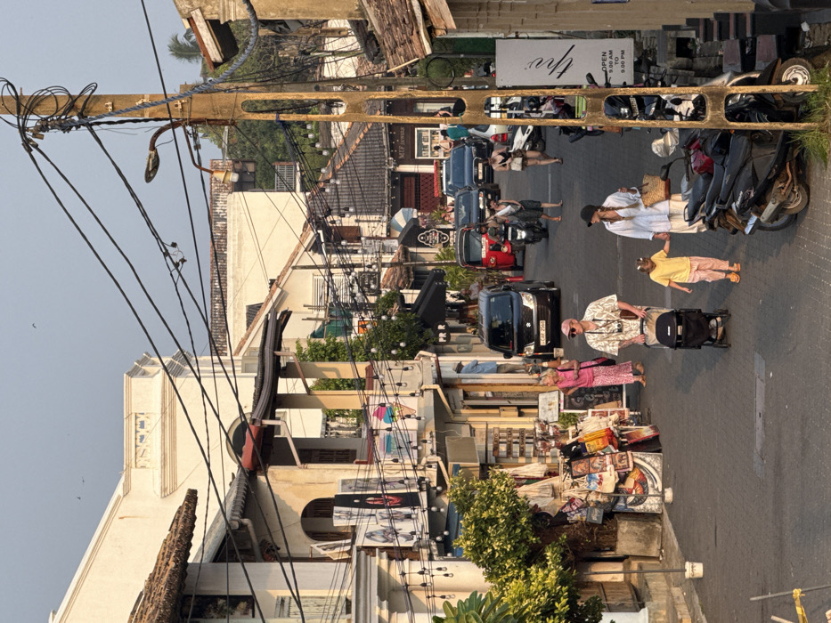 This image depicts a street scene in Galle, Sri Lanka, characterized by colonial-era architecture and dense urban activity. The time of day appears to be late afternoon or early evening, evidenced by the warm, directional lighting. In the immediate foreground on the right, a weathered concrete utility pole stands vertically, heavily laden with a tangled network of numerous black electrical and communication wires. An attached streetlamp fixture extends from the pole. Below the lamp, three motorcycles or scooters are parked parallel to the pole. A partially visible white sign with black text, including "thv" and operating hours "OPEN 9.00 AM TO 9.00 PM," is affixed to the pole. The paved street, which inclines slightly uphill, is active with both pedestrians and vehicles. In the center-left, a family of three walks towards the viewer. A male adult, wearing a light-colored hat, sunglasses, and a patterned short-sleeved shirt, pushes a black stroller. Beside him, a young child in a yellow t-shirt and striped light pink pants holds hands with a female adult, dressed in a white long-sleeved shirt and striped light pink pants, carrying a straw bag on her left arm. Traffic on the street moves away from the viewer. A black Suzuki Ertiga (license plate LK-CAR 2568) is positioned on the left side of the street. Further up the street, a red three-wheeled tuk-tuk is visible, followed by a dark-colored SUV, possibly an Audi. A person on a black scooter is seen between the tuk-tuk and the SUV. On the left side of the street, a female adult in a pink top and patterned skirt stands on the sidewalk, examining merchandise displayed outside a shop. This section of the street is lined with two-story buildings featuring cream or white facades, some with exposed brick or stone elements. The ground floors house various shops, displaying goods such as bags, artwork, and crafts on racks and shelves that extend onto the sidewalk. String lights are strung across some shopfronts. Further back on the left, a prominent white building with classical architectural details and a flat roof is visible. The right side of the street beyond the utility pole reveals more buildings, some with dark, possibly tiled, roofs. One shop has a dark awning. The entire scene is crisscrossed by a complex web of overhead electrical wires connecting to the utility pole and various buildings. The sky above is a clear, light blue, with a few faint, distant birds visible. Green vegetation, including potted plants and small trees, adds color to the sidewalks.