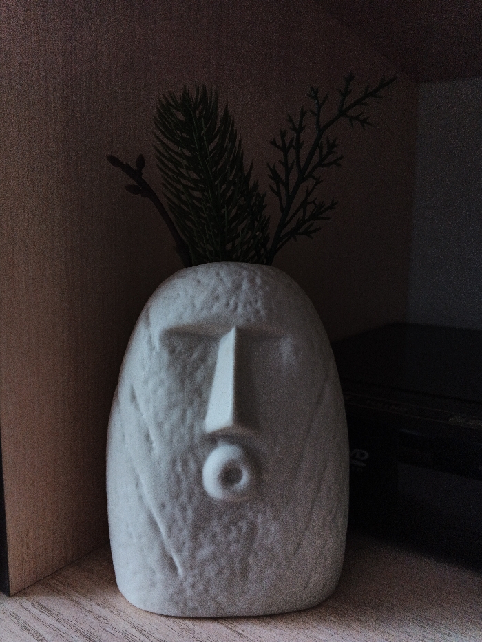 A light-colored, textured ceramic or concrete vessel, sculpted to resemble a stylized human head with a prominent rectangular nose and a circular, raised mouth feature, is centrally depicted. Artificial foliage, consisting of a dark green, feathery sprig and multiple slender, branched elements, protrudes from the vessel's top opening. The vessel rests on a light wood-grain horizontal surface. To the left, a vertical light wood-grain panel is visible. To the right, a dark, rectangular electronic component, possibly a DVD player, is partially observable on the same surface. The background consists of a solid, dark brown vertical plane. The scene is an interior setting in Chaikovsky, Russia, characterized by ambient, low-level illumination, which produces visible image grain. No people are present.