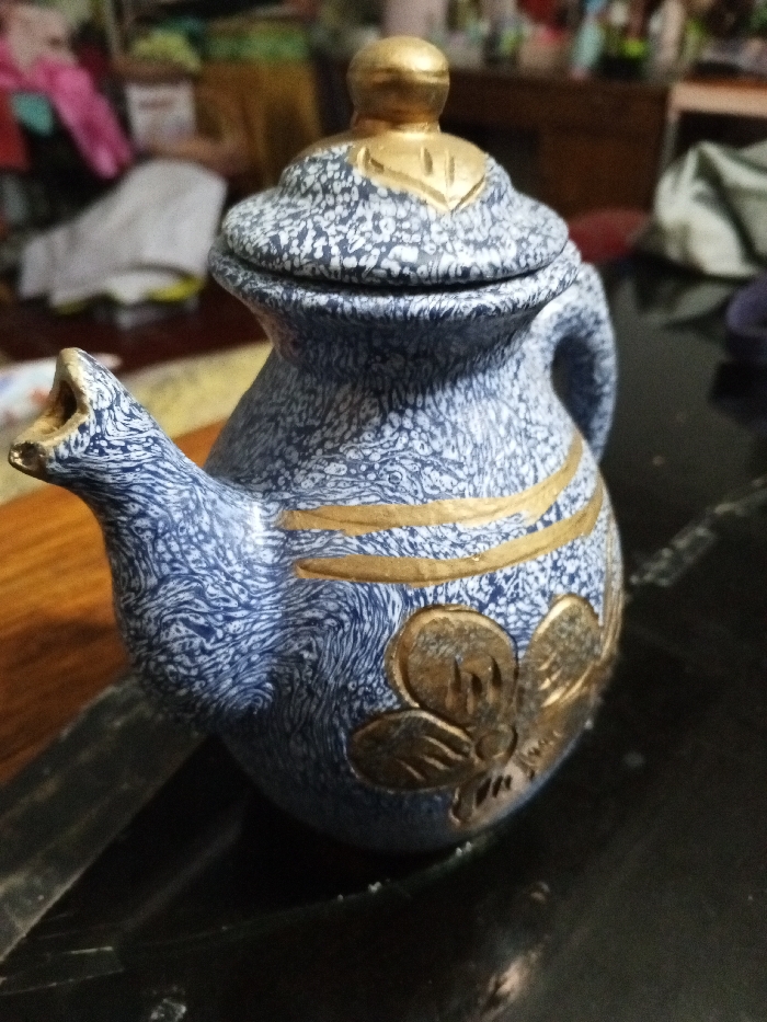 A ceramic teapot, approximately eight inches tall, is centered on a dark, reflective surface within an interior setting in Longmiang, Laos. The teapot is predominantly blue with a white speckled pattern, resembling marble or granite. It features a prominent gold-colored spout on the left, a matching gold-colored handle on the right (partially visible), and a gold finial atop its lid. Two horizontal gold bands encircle the mid-section of the pot, and a gold floral motif with three distinct petals is present on the lower half of its visible side. The background is out of focus, revealing indistinct shapes of household items, including what appears to be folded fabric or clothing in pink and white hues, and parts of furniture. No people, actions, or interactions are present in the scene.