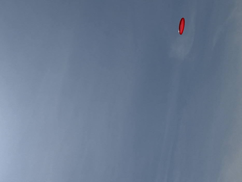 - "The image displays a solitary, circular red frisbee captured in mid-flight against a vast, clear, light blue sky" by FM-La8Z13, licensed under CC BY 4.0
